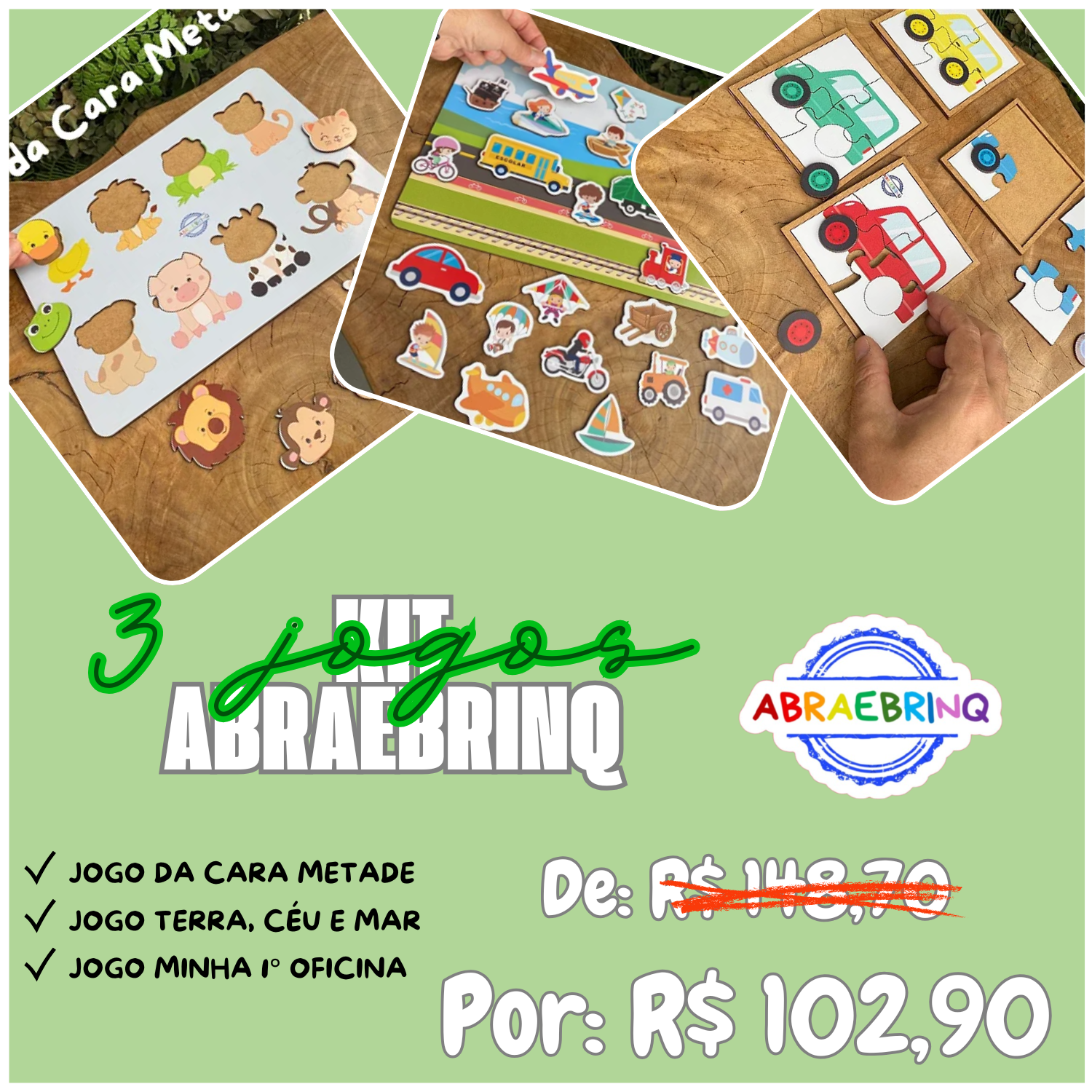 O que você encontra neste kit: Jogo cara metade + Jogo Terra, Céu e Mar+ Minha primeira oficina